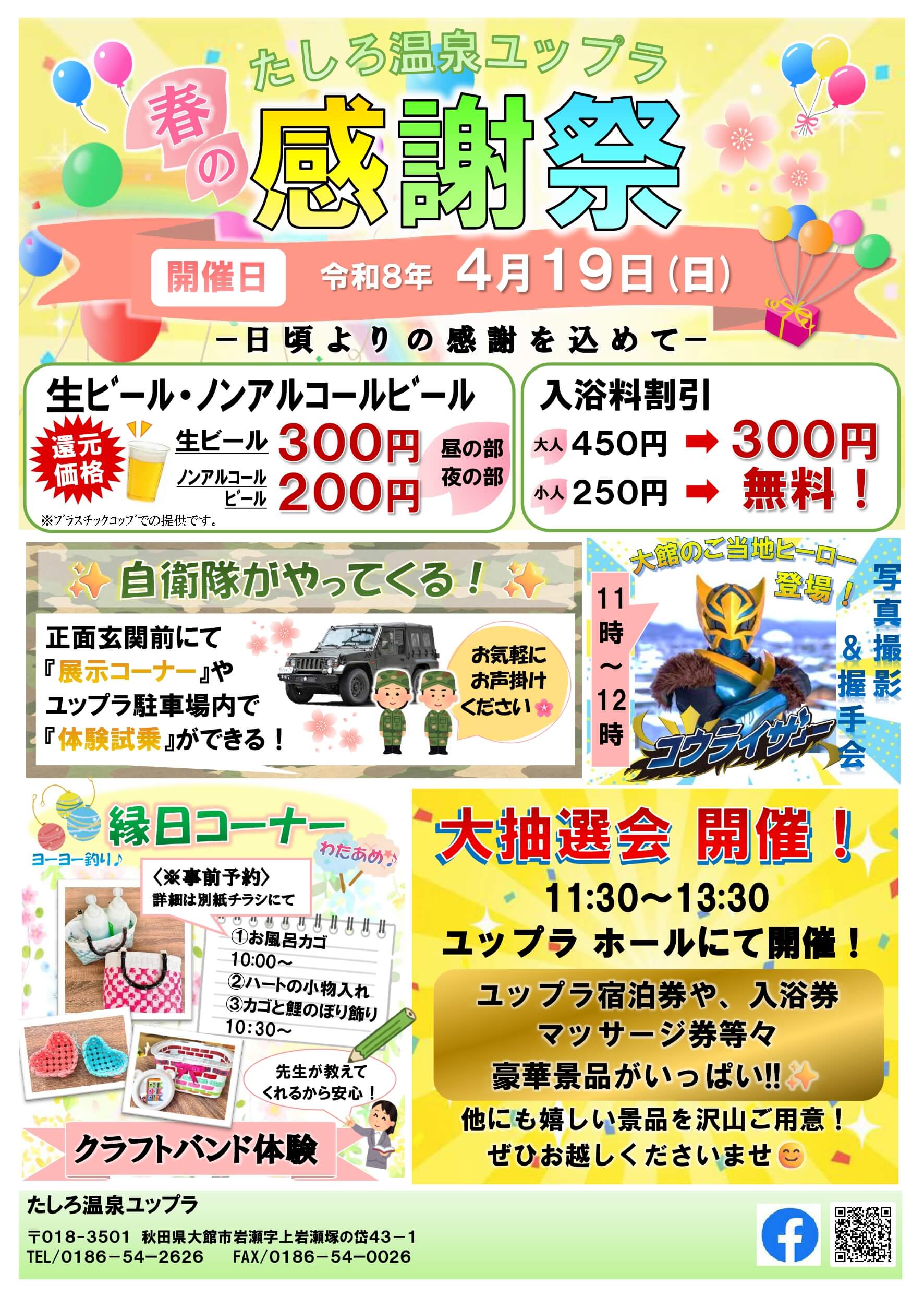🌸イベント開催のお知らせ🌸 日頃よりたしろ温泉ユップラをご愛顧いただきまして誠にありがとうございます! この春もユップラは周年を迎えることができました☻ これもひとえに、ご来館いただきました皆様のおかげです。 これからも […]