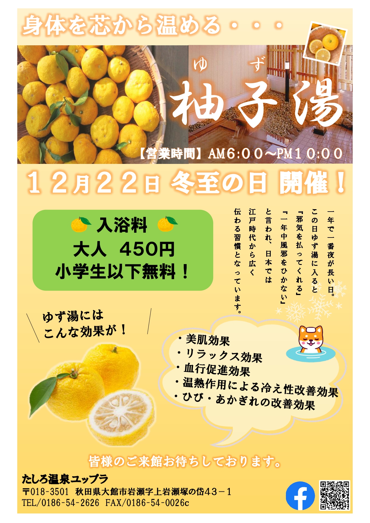 たしろ温泉ユップラよりお知らせです! 令和7年12月22日 冬至の日は、露天風呂にて柚子湯をご用意致します。 厄除けと日頃の感謝を込めて、通常は、入浴料 小学生¥250でご提供しておりますが、 当日は小学生以下『無料』で […]