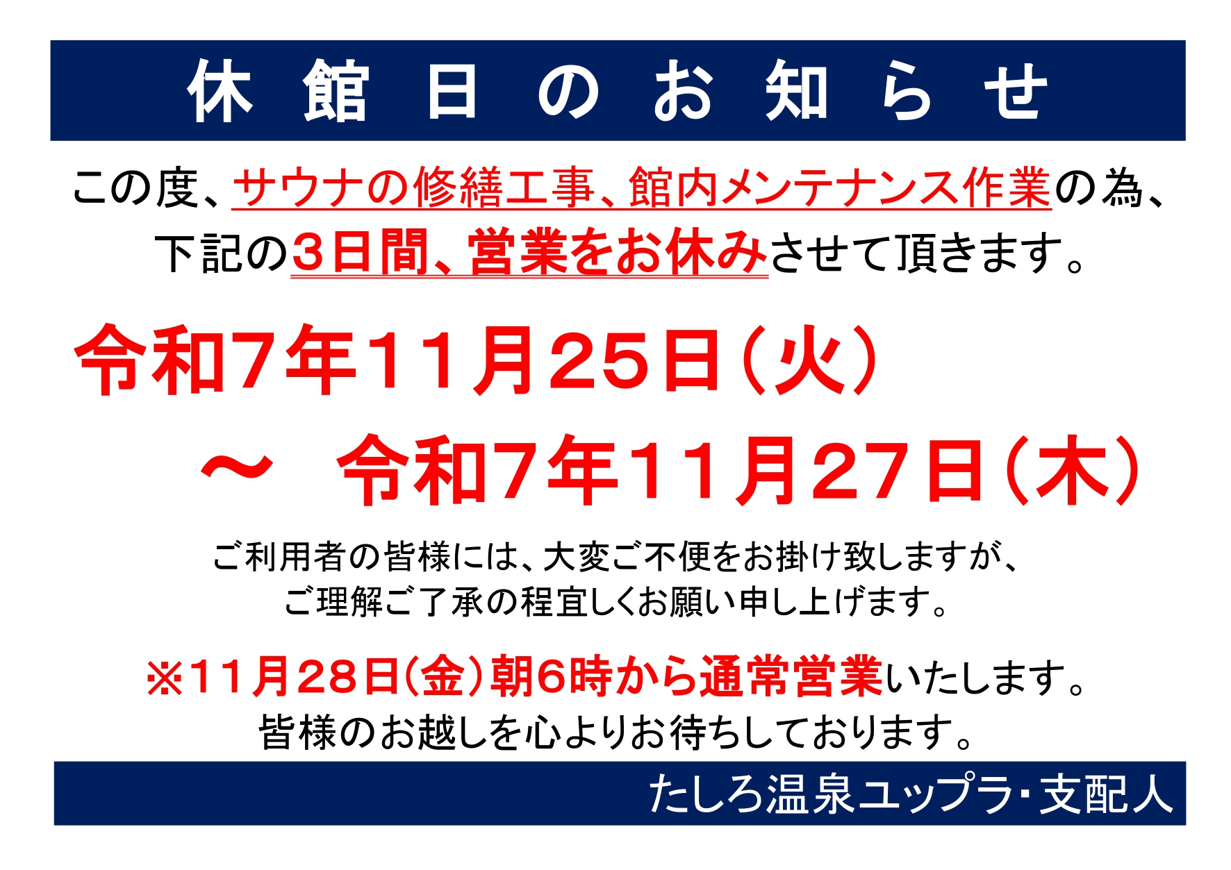 この度、館内メンテナンス作業の為、下記の7日間の営業をお休みさせていただきます。